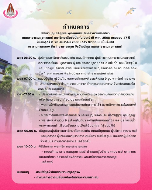 ปชส : กำหนดการพิธีทำบุญเจริญพระพุทธมนต์ในวันคล้ายวันสถาปนา คณะสาธารณสุขศาสตร์ มหาวิทยาลัยขอนแก่น ประจำปี 2568 ครบรอบ 47 ปี