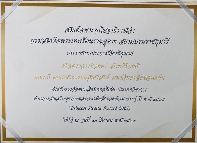 On March 16, 2026, Professor Dr.Wongsa Laohasiriwong, Dean of the Faculty of Public Health at Khon Kaen University, received the prestigious "Outstanding Individual in Health Promotion and Environmental Health Award for 2025." The award was graciously conferred by Her Royal Highness Princess Maha Chakri Sirindhorn at the Miracle Grand Convention Hotel in Bangkok.